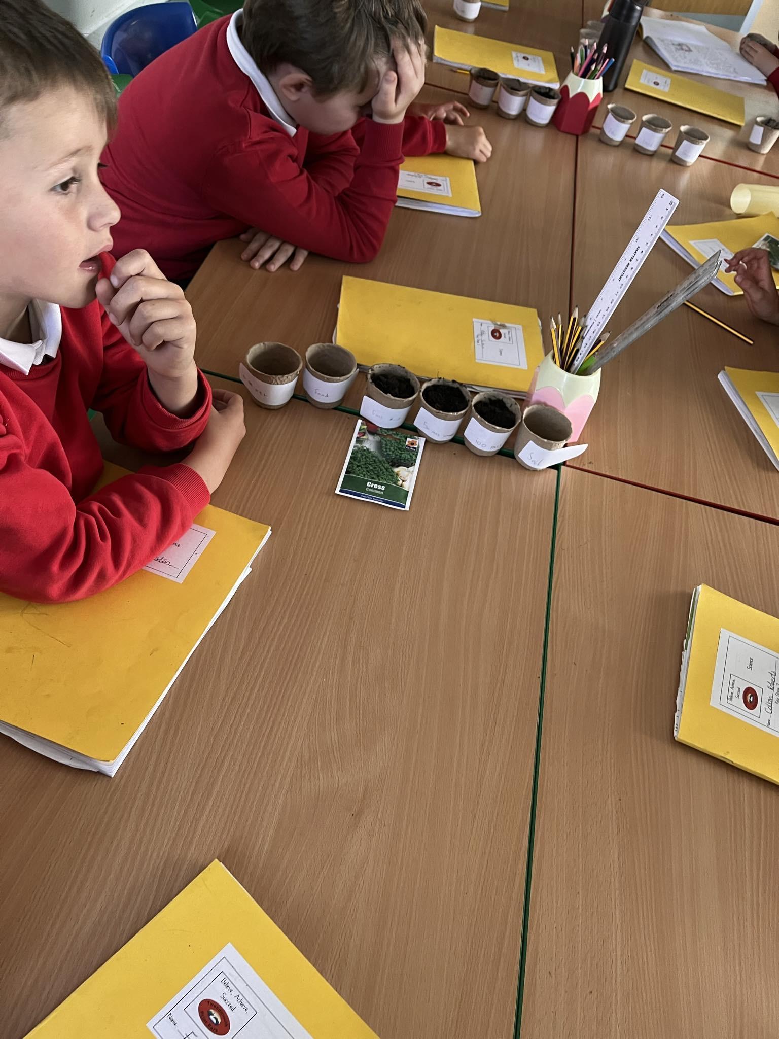 In science we are investigating the amount of water a plant needs to grow and if a plant can only grow in soil.
