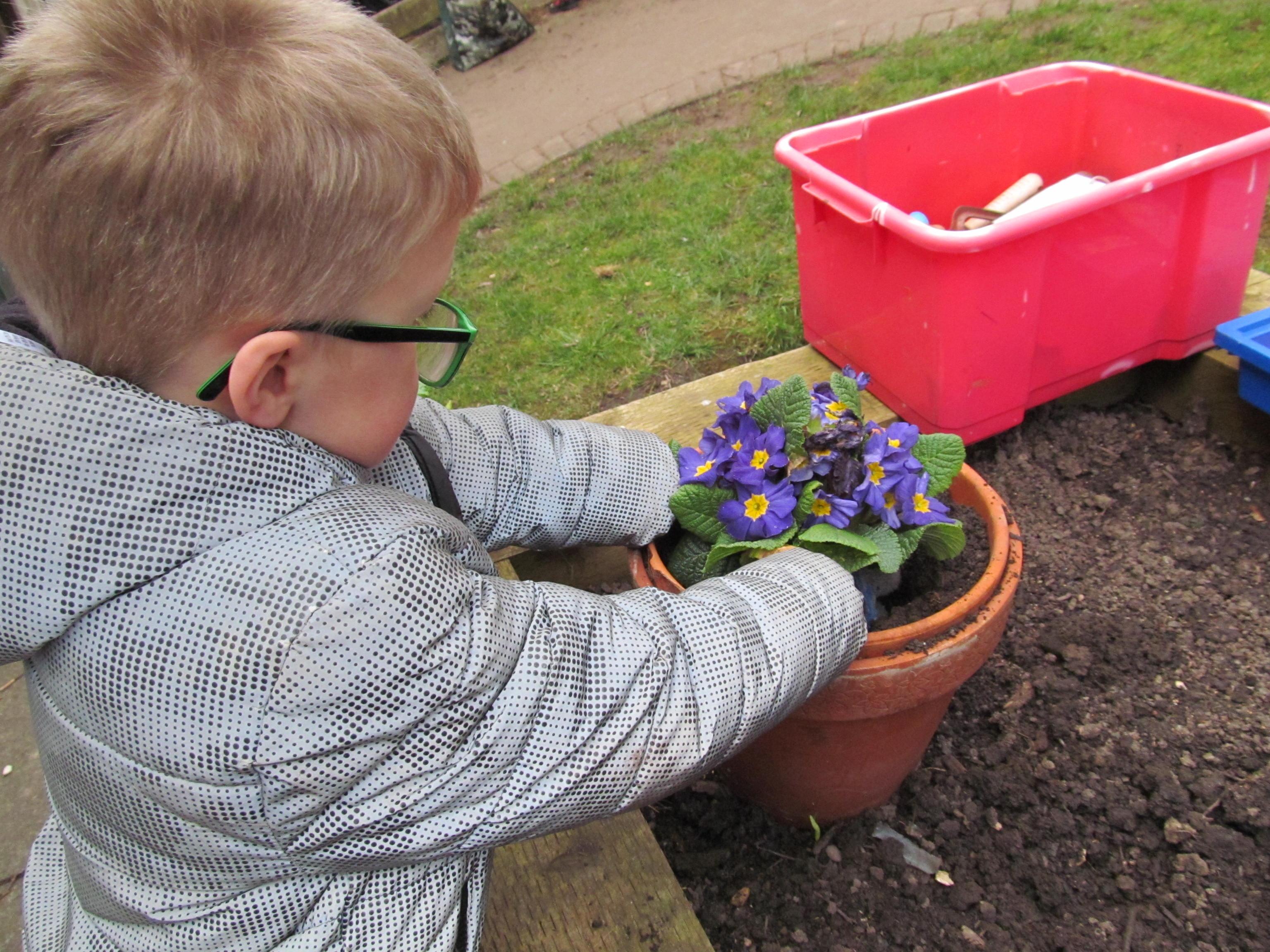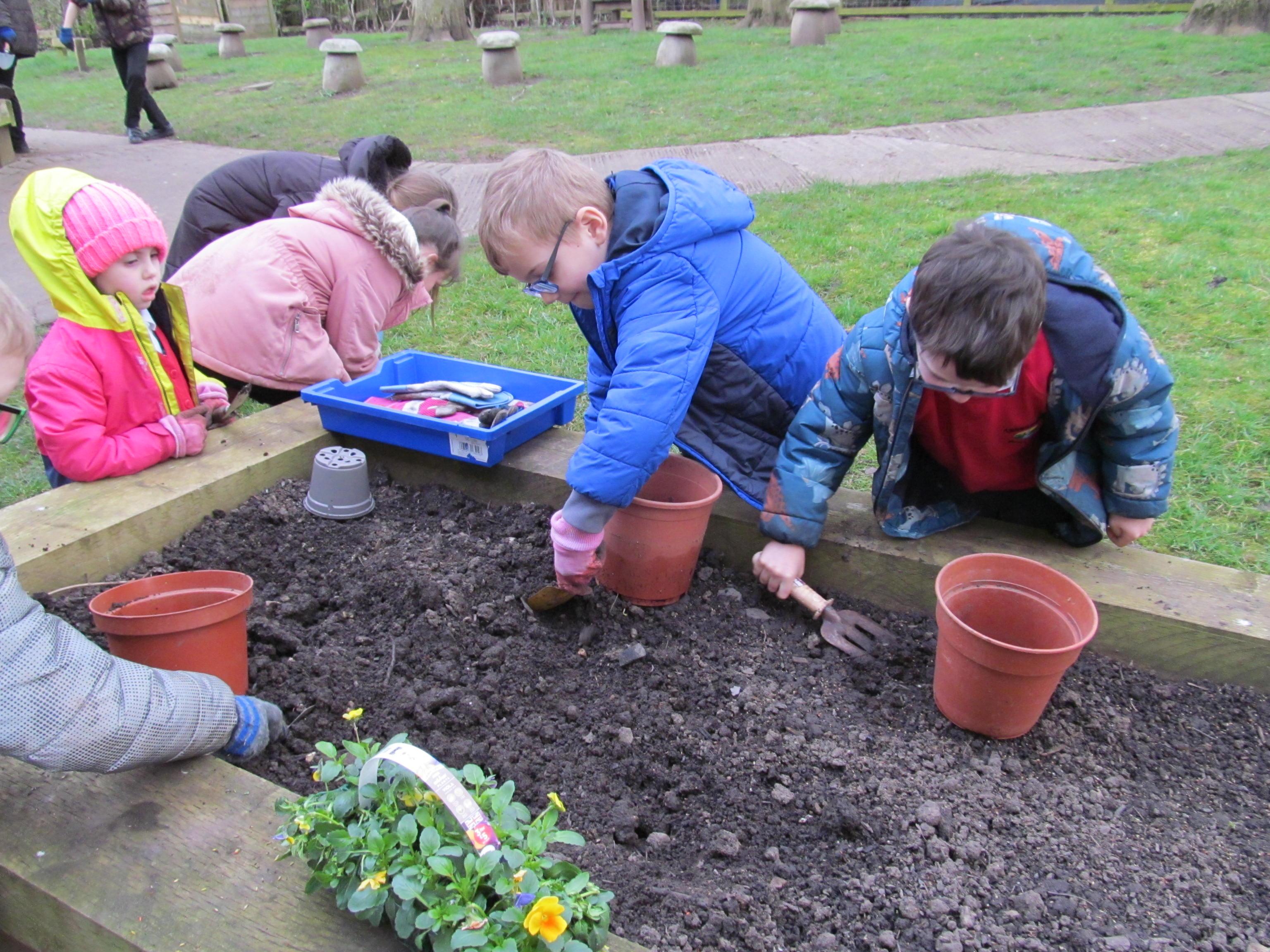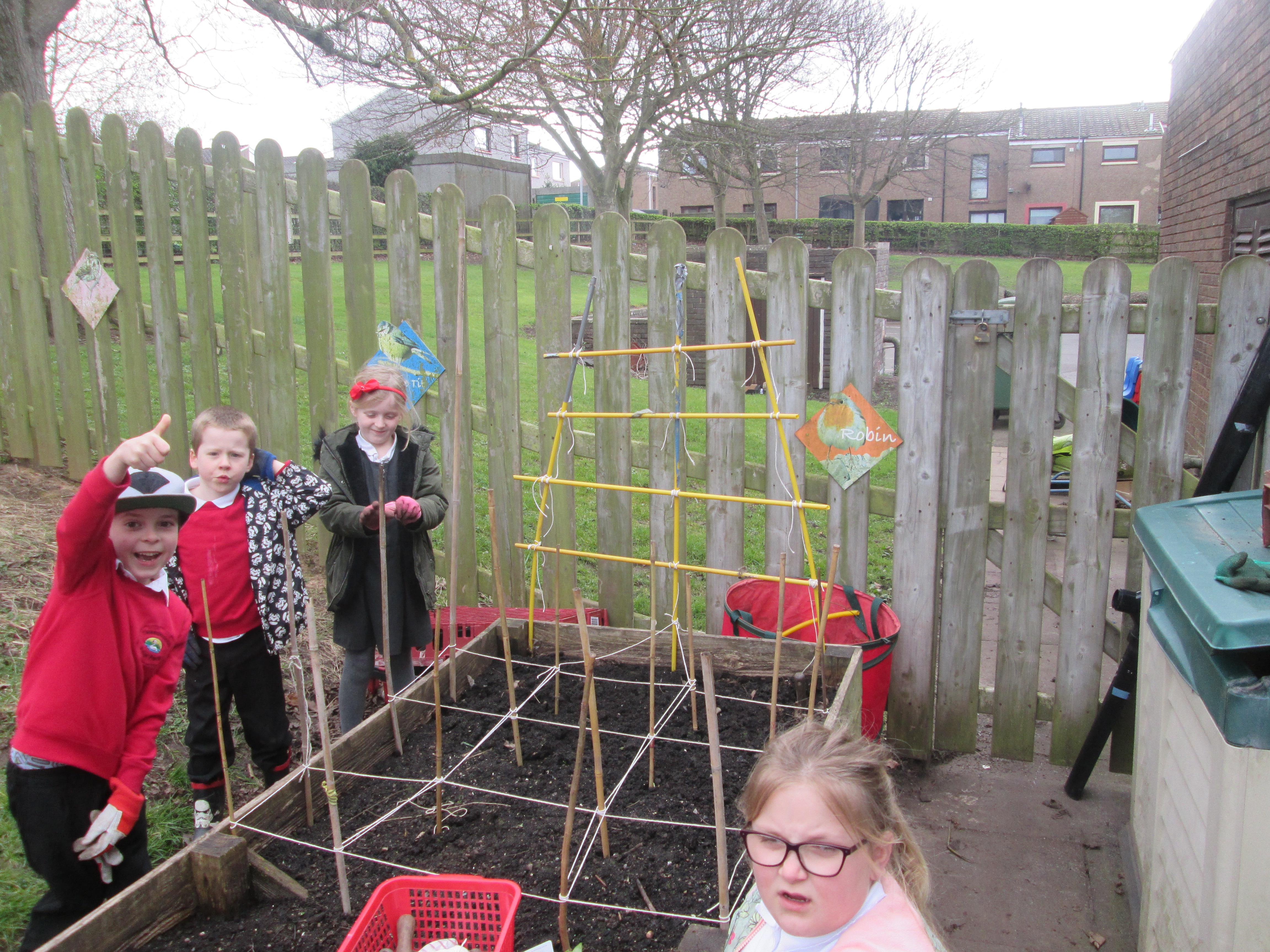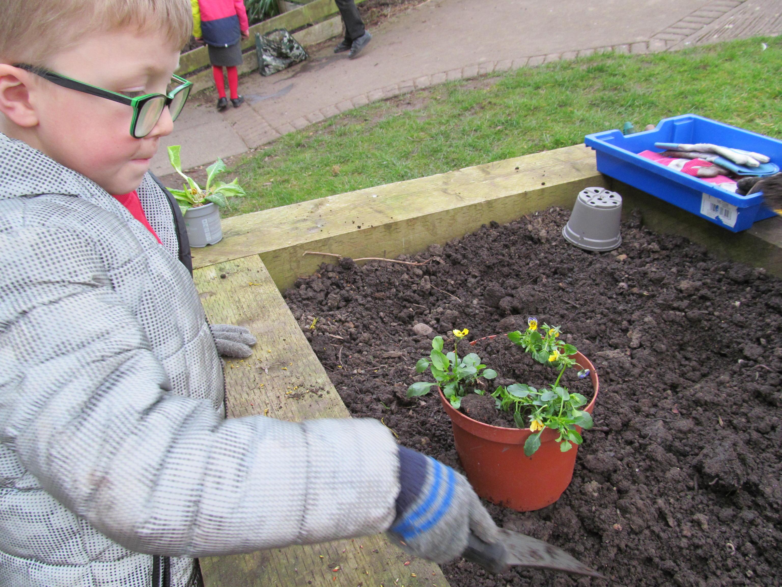 Our green fingered gardeners are now preparing the ground for our potatoes, planting up bedding plants and checking on their recently germinated seeds.